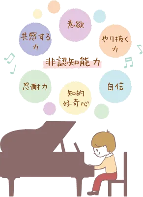 ピアノ学習によって高められると考えられている能力に、「非認知能力」と呼ばれるものがあります。IQなど数値化して測れるような知力、学力を主に「認知能力」と呼ぶのに対して、数値などでは測りにくく、目には見えにくいけれども、人が社会で生きていくために必要な諸能力が、「非認知能力」として近年世界的に注目されています。