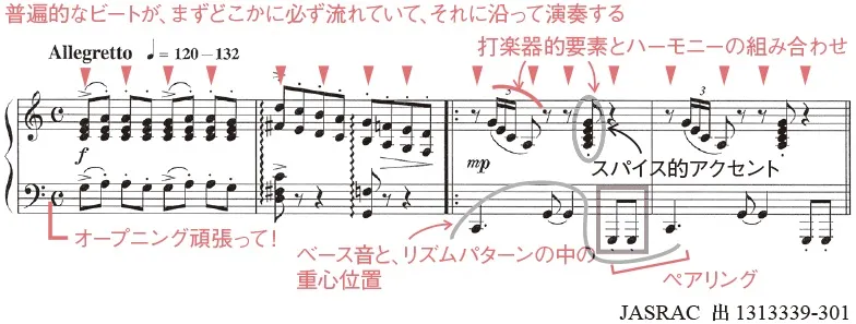 出典:みんなのピアノワールド 仲間と連弾編(音楽之友社)わくわくポピュラーガイド(さどはら知子)TOPオリジナル曲は、演奏に参加している楽器の役割がそれぞれとてもはっきりしていています。この編曲もそれを受け継いでいますので、個々のパートやフレーズがどんな性格のものかをしっかり把握して、それぞれがバンドの一員を担うようなつもりで弾いてください。まずは個々の役目を全うすることに集中した方が、良い結果が得られるでしょう。その上で、全体の演出を考えるようにしてみてください。きっと自然な音楽が聞こえてくると思います。アーティキュレーションは、フレーズのニュアンスを表すものなので、とらわれすぎないようにしましょう。