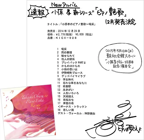 今回Newアルバム「小原孝のピアノ艶歌」を、大真面目に(笑)キングレコードの演歌部門から出すのですが、昭和の演歌をピアノソロにした新シリーズで、やはり原曲のイメージ、歌詞を大事にアレンジしました。「雨の慕情」「人生いろいろ」「悲しい酒」など、ちょっとした仕掛けもあるので、そのあたりもお楽しみに!