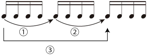 特に16分音符が続く箇所など、速くなってしまう部分では、そのフレーズを取り出してメトロノームにあわせるとよいですね。具体的には、図の①、②のように1拍目から次の拍頭までをメトロノームに合わせて弾き、それから③のように長く弾いていく「クローズアップ練習」を指導しています。そうすることで、指が転んでいるので遅くなる、あるいは速くなるという事もみえてきます。
