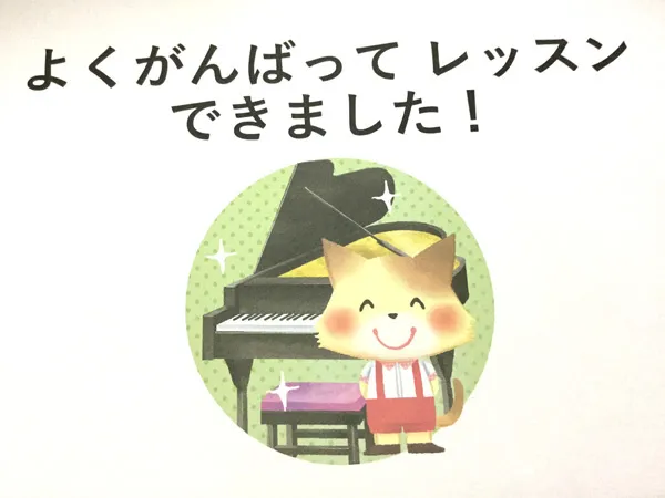 基本的にはこのコロナの状況の中では、年中さんまでは保護者1人同伴、年長以上は1人で参加することにしていますので、お母様がレッスン室に入られないご家庭へはレッスン内容を携帯電話で動画を撮ってお送りするようにしています。またレッスンの前後に、書き込みした楽譜やポイントを送る時には、「よく頑張ってレッスンできました」や「次のレッスンも楽しみ」などのプレートもいつも入れていました。