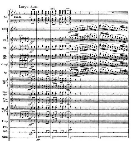 Clch(Cloch)が鐘のパートです。359小節からfffで鐘が打ち鳴らされ、フィナーレへ向かう楽曲を華々しく盛り上げていきます。