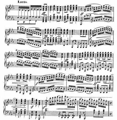 総譜と照らし合わせると、譜例2の2小節目から22小節目まで鐘が鳴り続けることになります。同時に、この作品の冒頭で提示されるロシア正教聖歌《主よ,爾の民を救い給え》(Спаси Господи люди Твоя)の旋律が再現され、鐘の音と一体化して、神聖な場が壮大に描き出されます。ピアノ版に鐘は指定されていませんが、この箇所に込めた作曲家の意図や心情に変わりはありません。演奏の際にはオーケストラの総譜を見て、鐘の音をイメージしてみるといいでしょう。