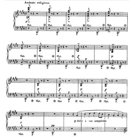 《小組曲》には7曲のピアノのための作品が収められており、それぞれ<尼僧院にて>、<間奏曲>、<マズルカ>ハ長調、<マズルカ>変ニ長調、<夢>、<セレナード>、<夜想曲>のタイトルが付されています。 第1曲の<尼僧院にて>は、少女時代を修道院で過ごしたアルジャンド伯爵夫人の若き日のエピソードがモデルとなっていると考えられており、静かな聖堂で「外の世界=社交界」を夢見る少女の心情が描かれています。ボロディンはアルジャンド夫人にこの曲集を献呈した際、この作品に大聖堂の「円天井の下で少女は神を想うことはない」との副題を書き添えましたが、出版に際して削除しました。Andante religiosoが指定され、宗教的な作風であることが示されています。冒頭と終結部に見られるゆっくりと下行する和音は、明らかに、教会の鐘「ペレボール」の音型の再現です。従って、この作品は鎮魂や告別のイメージと強く結ばれています。あるいは、ボロディンの副題が示す通り、この作品は人との死別ではなく、神や信仰との別れ、すなわち、「修道院との訣別」を思う少女の心を表したものであるとも考えられます。[譜例 1]