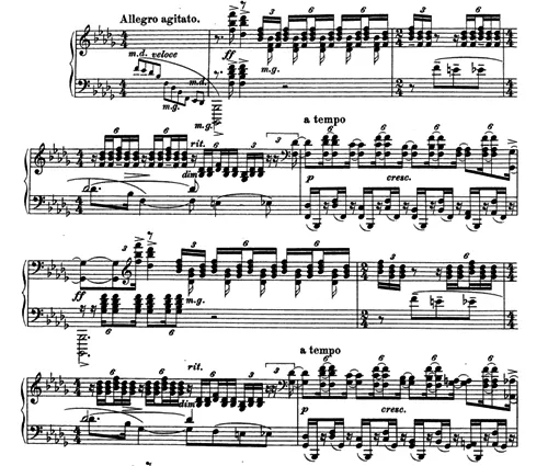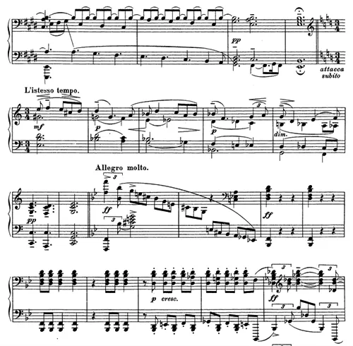 ラフマニノフ:ピアノ・ソナタ第2番(初版)より。陰鬱な下行音型が弱音で示される中で第2楽章が幕を閉じ、Allegro moltoではじまる第3楽章は第1楽章の冒頭と同様、フォルティッシモで幅広い音域を下行する音型と連続する同一音の組み合わせによって開始されます。