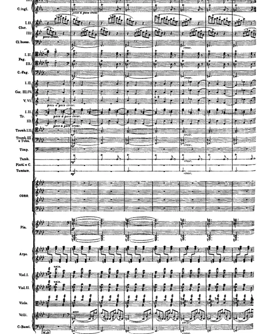 警鐘を描いた第3曲では、激しく、単調に打ち鳴らされるナバトの鐘の音が全編にわたって再現されます。 例えば、練習番号56からはホルン、ファゴットなどが同一音(C)を繰り返すことで「打ち鳴らされる大鐘」を表現し、同時にハープが恰も「小刻みに鳴らされる小鐘」を表すかのように八分音符の和音(DFAs)を反復します。これらに加えてトランペット、弦楽器(バイオリン、ビオラ)が3つの音を異なる音型で繰り返します。【譜例 1】こうした警鐘の描写に重ねて、グレゴリオ聖歌《怒りの日》の旋律が、大火に恐怖する人々の心情を描きだすかのように断片的に呈示されます。