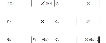使われるコードは、トニック、サブドミナント、ドミナントの3種類トニックもサブドミナントも、ドミナント・セブンス(属七)を用いることが多い。