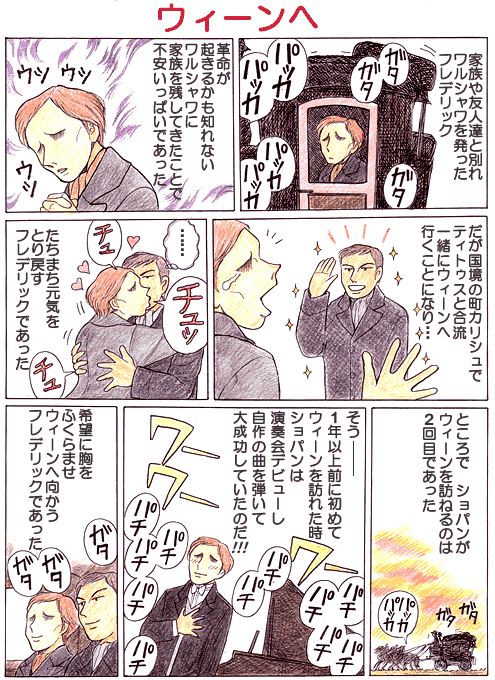 ショパンは友達4人(ティトゥスはこの時は一緒ではない)と初めてウイーンを旅行した時、楽譜出版商のハスリンガーを訪ねた。前々から楽譜を送ったりしていたのだ。 そのハスリンガーと劇場支配人に勧められて演奏会を開くことになり、それがウイーンでのデビュー演奏会となった。 ベートーベンの弟子でピアノの教則本で有名なチェルニーからも、ショパンは大変誉められたという。