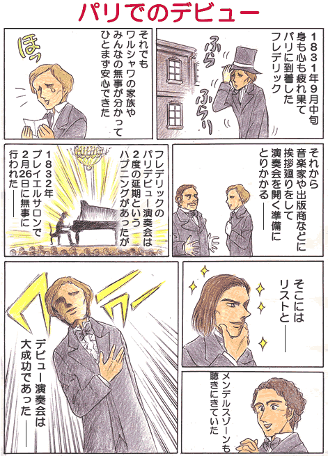 3.リストたちとの出会い パリ・デビュー演奏会の前に、ショパンはすでにリストとは1831年の秋に会って交友していた。メンデルスゾーンとも、1831年の12月にメンデルスゾーンがパリに来た時、ヒラーの紹介で会っていたという。