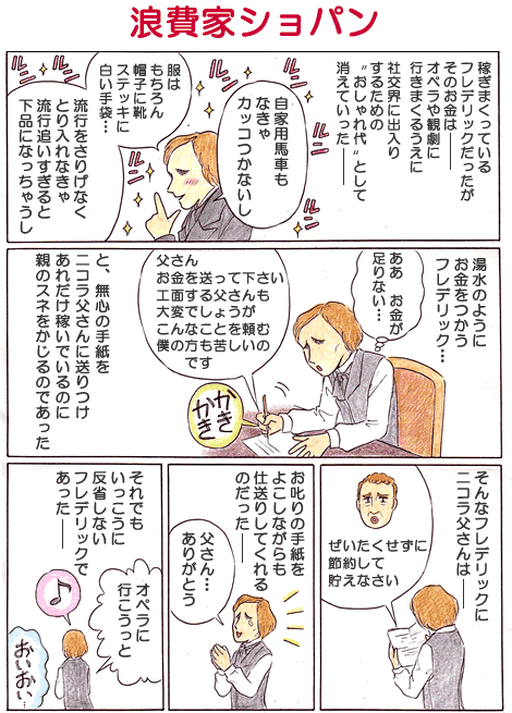 社交界では、いかに品良く見せるかが重要なので、こういったものにお金がとんでいったようだ。 さらに、身に付けるものはもちろん、他にも時計、香水、カフスボタン、櫛などの小物は全て一流品で、家具の調度品にもこだわったという。部屋には花が飾られ(ショパンは花が大好きである)この花代もバカにならなかったらしい。
