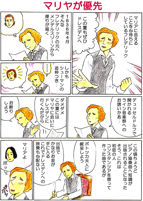 1.ライン音楽祭 ショパンは前にも(1834年)友人ヒラーに誘われてライン音楽祭に行ったことがある。この時デュッセルドルフのオーケストラ指揮者だったメンデルスゾーンとも再会し、3人で音楽祭を楽しんだという。