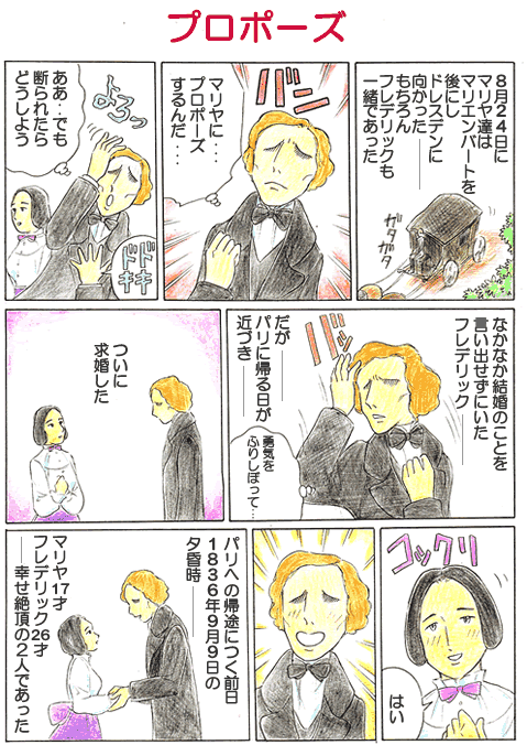 DEC 31, 2004 第031回 プロポーズ 連載 1.プロポーズ マリヤたちは8月24日マリエンバートを後にし、ドレスデンに向かう。ショパンも同行し、ドレスデンに滞在する。なかなか結婚の申し込みができないでいたが、パリへの帰途につく前日の9月9日黄昏時に勇気を振り絞ってプロポーズしたといわれる。 林 倫恵子(はやしりえこ) 漫画家・ピアノ指導。ホームページ ショパン物語(林 倫恵子)TOP 連載一覧に戻る 第030回 マリヤと再会 第032回 結婚の条件 現行サイトで見る → こちらも読んでみませんか 実は重厚な冒頭から調性不安定へ、2022年ようやく完成版実現 山田 耕筰「Erinnerungen an mine Kobe zeit(わが神戸時代の想い出)」 実はアメリカではどこで弾いても人々に喜ばれるレパートリーです ロシェロール「アメリカン・パノラマ」 1歳で母を失い、ラフマニノフと共に学んだ天才 スクリャービン