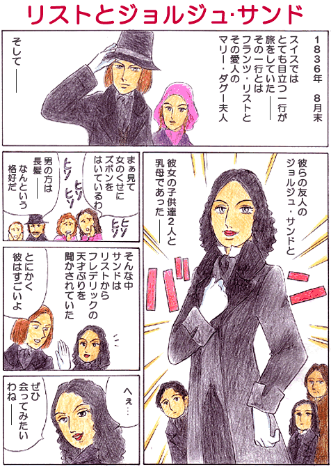 1.親友リストと交流 ジョルジュ・サンドは以前からリストとサロンなどで交流があった。また、リストが逗留しているスイスにサンドが遊びに行ったり、サンドのノアンの館にリストとその愛人であるマリー・ダグー夫人を招いたりして、3人は、この頃はまだ仲良く交流していたようである。