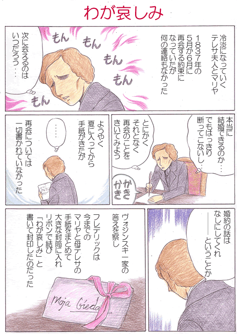 1837年の5月か6月に再会する約束になっていたのに、テレサ夫人からは再会については何の音沙汰もなかったという。テレサ夫人は、マリヤとの婚約について一応承諾した手前もあって、はっきりと断らずに返事を引き延ばし、そのうち冷淡な態度をとっていき、便りを書かない、という方法をとったらしい。