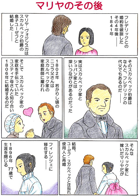 ユーゼフ・スカルベックと結婚したが、ユーゼフとは1846年に夫の不能を理由に離婚が成立する。(離婚成立を1848年とする説もあり、2年間揉めていたとも考えられる)1848年に使用人と再婚し、フィレンツエへ移住する。マリヤは息子をもつが、(ショパンと同じ結核で)4歳で亡くなり、その後、子供には恵まれなかったらしい。夫は1881年に亡くなり、マリヤは、ポーランドに戻り、1896年77歳で亡くなる