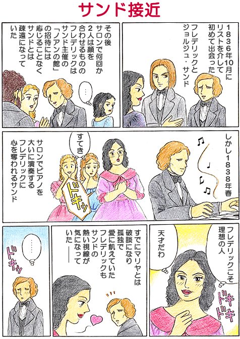 JUN 16, 2005 第043回 サンド接近 連載 1.再会 1838年4月半ば、サンドは1年3ヶ月ぶりに、友人のマルリアニ伯爵夫人のサロンでショパンと再会したという。ショパンは、マルリアニ伯爵夫人の夜会によく招かれて、見事な演奏を披露していたという。こうして、サンドとショパンはまた、しばしば会うようになる。 林 倫恵子(はやしりえこ) 漫画家・ピアノ指導。ホームページ ショパン物語(林 倫恵子)TOP 連載一覧に戻る 第042回 マリヤのその後 第044回 愛の始まり 現行サイトで見る → こちらも読んでみませんか 実はユゴーが交霊術で呼び出した「賢者たち」がテーマ ラヴィーナ「賢者たち Op.54」 低音域でのフォルテの変化が独特の響きを生む ギロック「村の踊り」 21歳でリスト音楽院入学の遅咲き作曲家 レンドヴァイ
