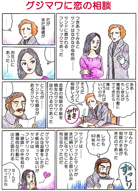 サンドのその32枚の手紙の内容は「自分が手を引くべきか」「マリヤと一緒になるほうがショパンは幸福なのか」「ショパンを苦しめたくない、ショパンのために自分はどうすればいいのか」などなど、五千語に及ぶ長文で相談していたのであった。