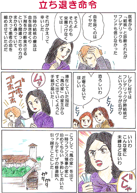 結核の診断を信じなかったサンドは、瀉血や断食を勧める医者を拒否し、ショパンに栄養をとらせるようにし、これがショパンにとって幸いしたようである。もし、この時点で、瀉血や断食を繰り返しさせていたら、ショパンはここで命を落としていたかもしれない。 栄養を十分にとるという結核の正しい療法は19世紀後半に入ってから確立されたという。 2.忌み嫌われた結核患者当時、スペイン領のマジョルカ島では、結核は悪事を働いた者への天罰だと忌み嫌われ、不治の伝染病として恐れられていた。