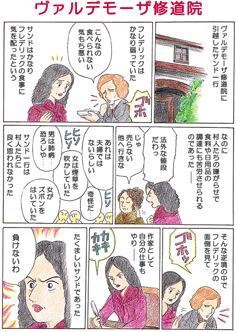 しかしヴァルデモザの住民たちからは嫌われ、嫌がらせを受けていたようである。ショパンは結核と恐れられ、サンドは若い愛人(ショパン)と同棲、男装をしたり葉巻を吸ったり、娘にもズボンをはかせたりしていたので、その行為が不道徳に思われ、住民から反感を買っていたらしい。
