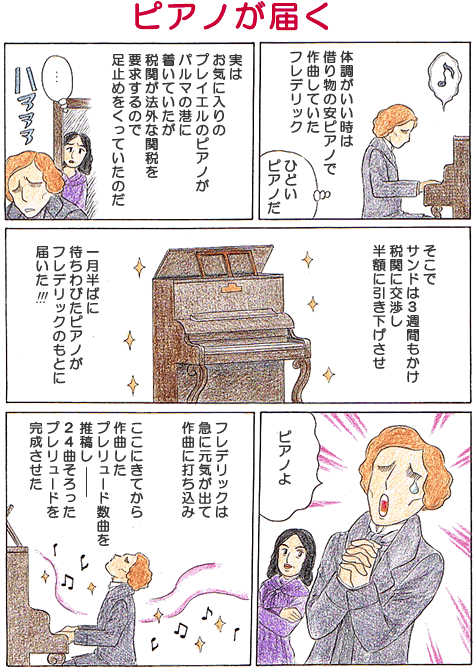 ようやく届いたプレイエルのピアノで24曲のプレリュードを完成させ、バラード2番、ポロネーズOp.42-2を完成させ、嬰ハ短調スケルツォ(第3番)にとりかかった。