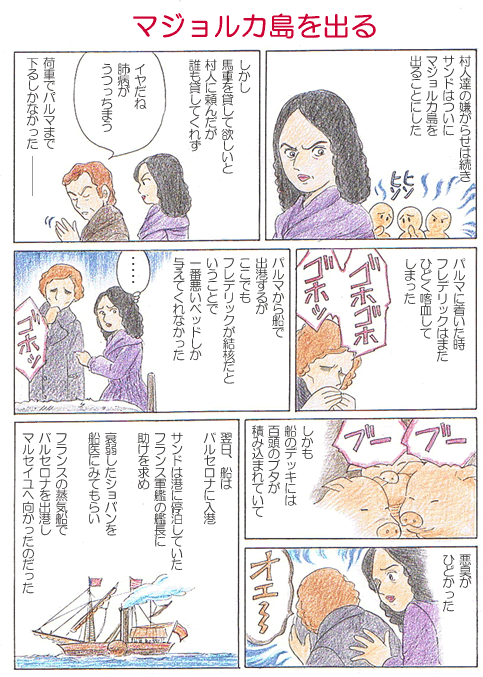 スペインの法律では結核患者が使用したベッドは焼却しなくてはならない決まりになっていたので、船でもショパンは一番悪いベッドしか与えられず、そこでもショパンは大量の血を吐いてしまった。