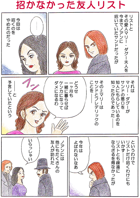 リストとマリー・ダグー夫人は、1837年の冬と春に、ノアンに招かれ滞在したことがある。しかし、マリーはサンドに敵対心を抱くようになり、そのことを、サンドは友人のマルリアニ夫人から聞かされるのである。ちなみにマルリアニ夫人は、フランス駐在のスペイン領事伯爵夫人(夫の伯爵は亡命イタリア人であり、亡命ポーランド人に同じ立場として共鳴していたという)であり、サンドより16歳年上で、よく文通をしていた。性格はかなりおしゃべりでおせっかいだったらしい。よくサロンを開き、ショパンも度々招かれていた。