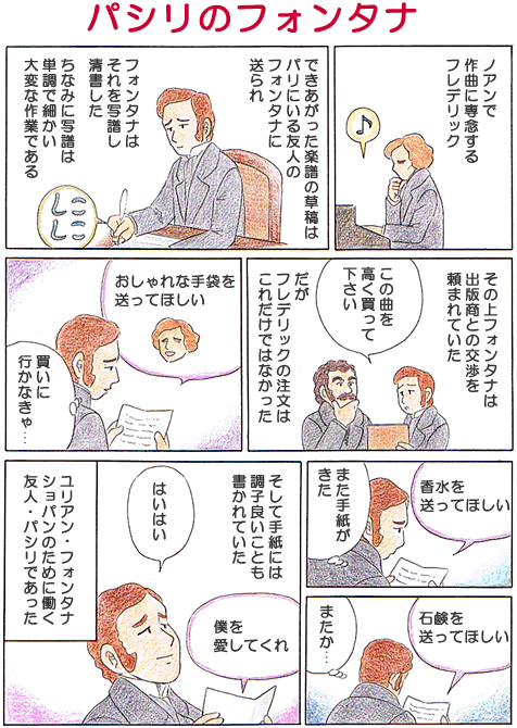 ショパンは、ワルシャワの家族に手紙を出すとき、サンドとのことを家族にあまり知られたくなく、マジョルカ島やノアンから手紙を出すとき、まずフォンタナに送り、パリから投函してもらっていた。