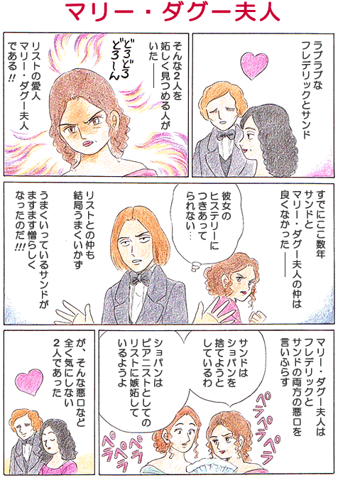 MAR 23, 2006 第063回 マリー・ダグー夫人 連載 1.サンドへの憎悪 マリーは、バルザックの小説「ベアトリックス」の中で中傷されたらしく、それはサンドがバルザックをたきつけたからと思い、サンドを憎むようになっていた。 林 倫恵子(はやしりえこ) 漫画家・ピアノ指導。ホームページ ショパン物語(林 倫恵子)TOP 連載一覧に戻る 第062回 パリでの生活 第064回 対照的な2人 現行サイトで見る → こちらも読んでみませんか テヌートとスタッカートの交替が即興性を醸す シベリウス「10のバガテル クプレ Op.34-4」 ドビュッシー編曲による2台ピアノ版が存在する シューマン「ペダル・フリューゲルのための練習曲(カノン形式の作品6曲) Op.56」 戦後日本の藝大で教えたオーストリア人教授 カン