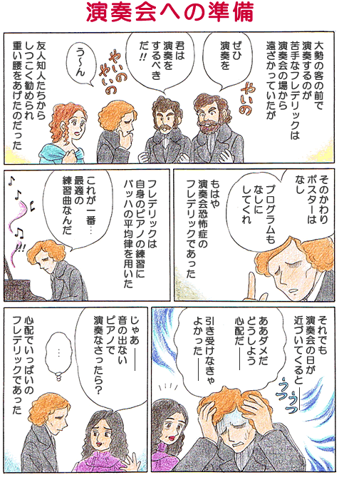 しかし不特定多数の人前で公開演奏することに恐怖心を抱いていたショパンは、かなり緊張していたらしい。話題にされるのが嫌で、ポスターもプログラムも嫌がり、作らせようとしなかったという。あまりの怖がりぶりに、サンドは「聴衆のいないところで、音のしないピアノで弾けば?」と言ったという。
