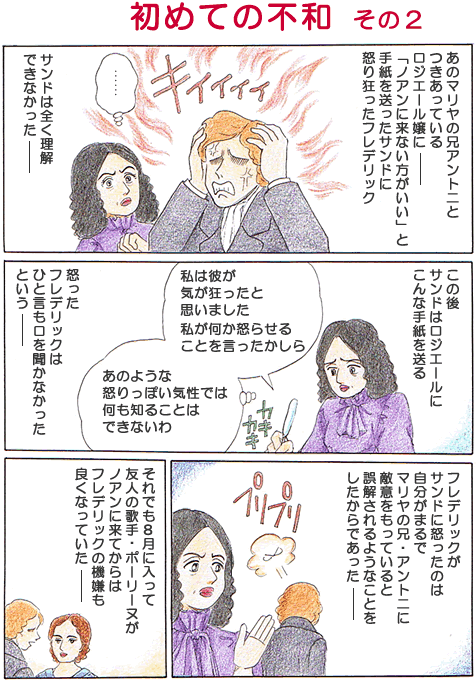 この年のノアンでは、ロジエーリ嬢への苛立ちのほかに、ノアンに新しく届いたプレイエルのピアノにも「音が悪い」と、荒々しい調子で、ピアノを交換させたり、下男を解雇したり、親友たちにヒステリー的な手紙を書き送ったりしていたという。