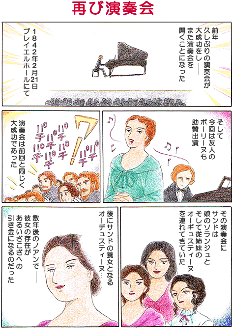 前年と同じプレイエルホールで、1842年2月21日に演奏会を開く。親しくしている友人の歌手のポーリーヌ、チェリストのフランコムも助賛出演する。曲は、バラード3番、プレリュード変イ長調、ノクターンとエチュードとマズルカを3曲ずつ、ポーリーヌの歌の伴奏をし、前回と同じく絶賛され、収入を得、大成功を収めた。