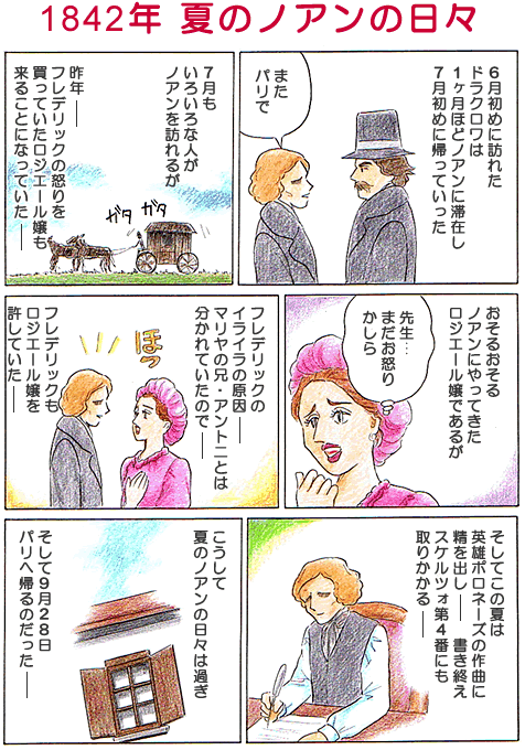 この1842年のノアンでは、英雄ポロネーズ、スケルツォ4番、マズルカOp50の三曲、バラード4番、即興曲3番を作曲した。