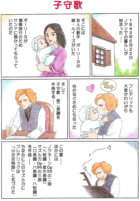 1843年5月中旬にノアンへ向かった。そのとき、ウィーンでの演奏旅行に出ていたポーリーヌの赤ちゃんをサンドは預かっていた。ショパンもこの赤ちゃんを大変かわいがり、このことがきっかけなのか、この夏に「子守歌」を作曲し始めた。