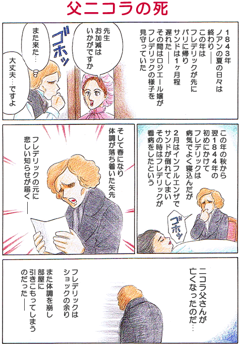 1844年5月3日に亡くなる。73歳であった。肺結核であったという。ショパンのショックは相当ひどく、サンドも「私には彼を慰める力がありません」と、ショパンの友人チェリストのフランコムに「ショパンを慰めに会いにきて欲しい」と助けを求める手紙を書いている。