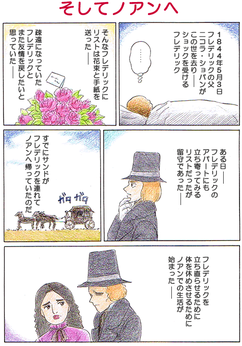 DEC 1, 2006 第081回 そしてノアンへ 連載 1.ノアンへ 1844年5月29日ノアンへ出発する。サンドは田舎でショパンの体を休めさせたいと考えていた。 林 倫恵子(はやしりえこ) 漫画家・ピアノ指導。ホームページ ショパン物語(林 倫恵子)TOP 連載一覧に戻る 第080回 父ニコラの死 第082回 ワルシャワの家族とサンド 現行サイトで見る → こちらも読んでみませんか 19世紀ロシアには馴染み薄いソナタ形式に挑んだ一曲 チャイコフスキー「ピアノ・ソナタ(大ソナタ) ト長調 Op.37」 実は不協和音と狂乱的なピアノ打撃で、内面の葛藤を表現 パルムグレン「24の前奏曲 第8番 アレグロ フェローチェ Op.17-8」 ユダヤ精神を音楽に込めた、スイス生まれアメリカで活躍 ブロッホ