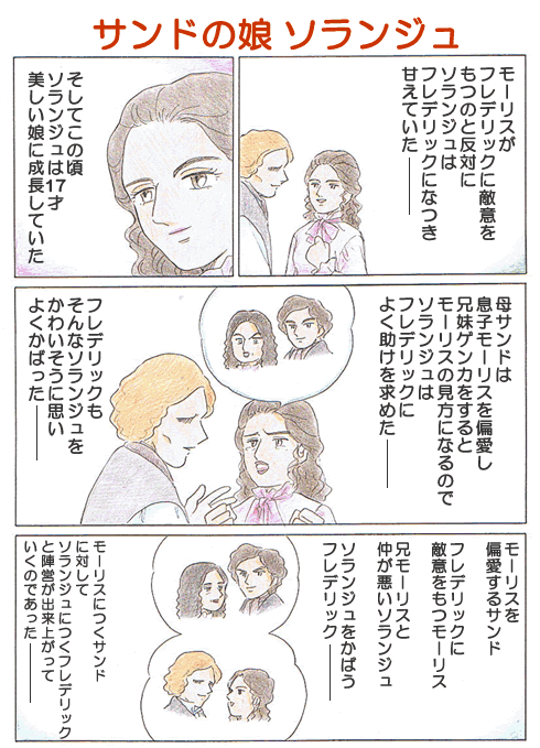 息子モーリスを偏愛する母サンド、ショパンに敵意をもつモーリス、母の愛を独り占めする兄モーリスと仲が悪い妹ソランジュ、ソランジュをかばうショパン、最初サンドは中立の立場をとろうとしていたが、次第にモーリスのほうへ傾き、モーリス・サンドに対するソランジュ・ショパンという陣営ができていくのであった。