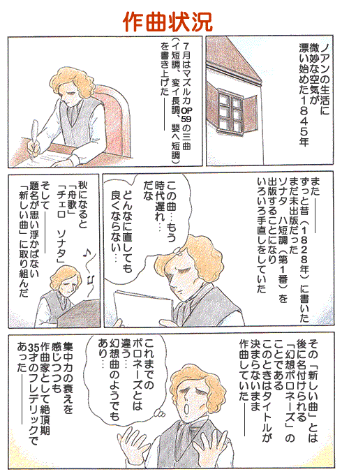 APR 20, 2007 第091回 作曲状況 連載 1.ソナタハ短調 ずっと昔1828年に書いた未出版だったソナタ第1番ハ短調がウィーンのハスリンガー社から出版されることになったのだが、いくら直しても満足がいかなかったという。 林 倫恵子(はやしりえこ) 漫画家・ピアノ指導。ホームページ ショパン物語(林 倫恵子)TOP 連載一覧に戻る 第090回 対立構造 第092回 1846年 最後のノアン生活へ 現行サイトで見る → こちらも読んでみませんか ノイヴィルトが原曲の雰囲気を活かしつつ変奏した ノイヴィルト「ディアベリ風ワルツ(ディアベリのワルツによる変奏曲)」 パガニーニの主題から24変奏を繰り広げる変奏曲の傑作 ラフマニノフ「パガニーニの主題による狂詩曲 イ短調 Op.43」 北欧評議会音楽賞受賞、シベリウスの影響受けたフィンランドの巨匠 コッコネン