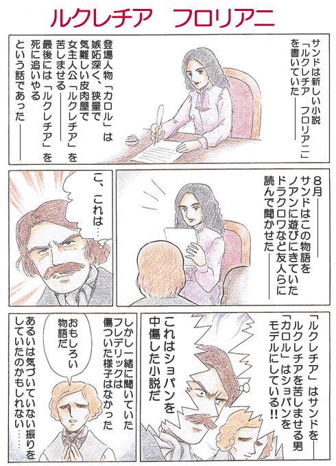 サンドのこの小説は、サンドとショパンをモデルにしたと言われる。小説の登場人物ルクレチア(サンド)は、嫉妬深く狭量なカロル(ショパン)の犠牲になり、死んでしまうという話である。