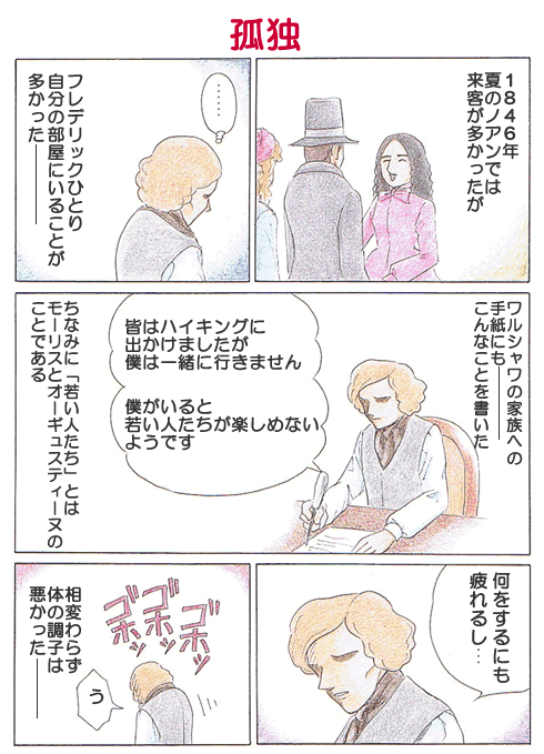 JUL 27, 2007 第097回 孤独 連載 1.一人で過ごすショパン□ 皆はよくハイキングにでかけたが、ショパンは体調も悪く、またモーリスと、そのモーリスに肩入れしているオーギュスティーヌがショパンを毛嫌いしていることから遠慮し、ひとり部屋で過ごしていたという。 林 倫恵子(はやしりえこ) 漫画家・ピアノ指導。ホームページ ショパン物語(林 倫恵子)TOP 連載一覧に戻る 第096回 ソランジュの婚約 第098回 ソランジュ婚約延期 現行サイトで見る → こちらも読んでみませんか 11小節目か30小節目か、最高音の位置からクライマックスを選ぶ スカルラッティ, ドメニコ「ソナタ ニ短調 K.5 L.367」 ポルトガル王への献呈曲集に含まれるト長調のソナタ スカルラッティ, ドメニコ「ソナタ ト長調 K.13 L.486」 フランス政府給費留学生としてパリで学んだ東京芸大出身作曲家 尾高 惇忠
