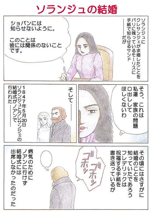 ショパンには、ソランジュの結婚のことを言わないでいたサンドは、ロジエール嬢 への手紙にも「ショパンを一家の主、家族会議の長にするわけにはいかない」と書い ていた。