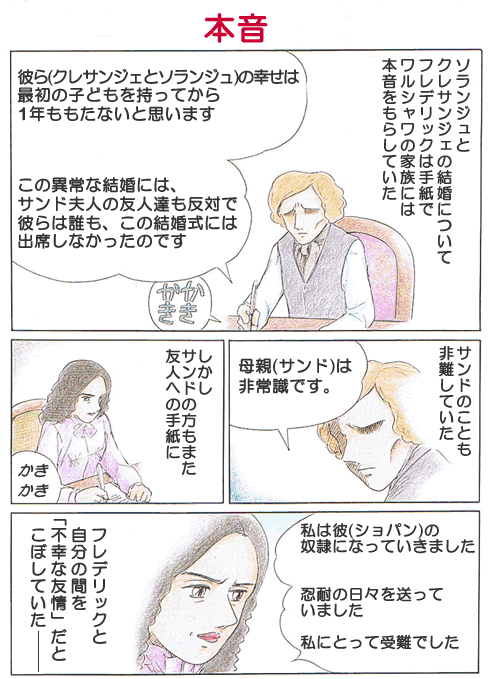 グジマワに宛てた手紙に、ショパンとの生活がいかに苦しかったを語った手紙があ るようである。そして「この手紙を焼き捨ててください」とも書かれていたようである。