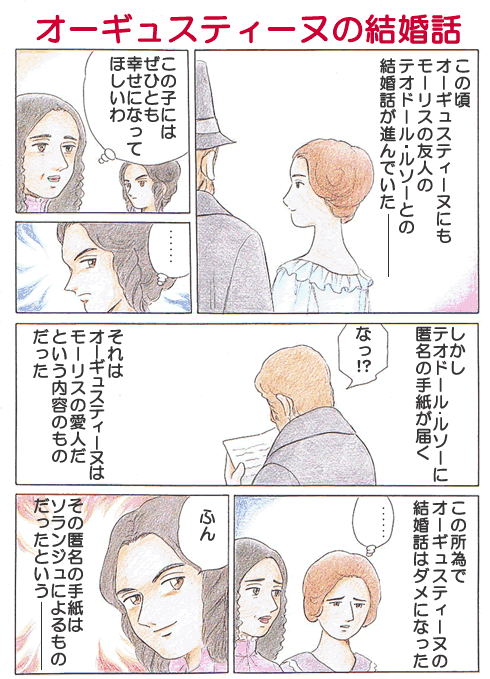 OCT 26, 2007 第103回 オーギュスティーヌの結婚話 連載 1.オーギュスティーヌの結婚話 1847年6月1日、養女にしたオーギュスティーヌの結婚話を取り決めるために、サンドはパリに出て2週間ほど滞在するが、多忙だったためショパンとあまり会わずにノアンに帰ってしまう。まだこの時はショパンも7月中旬にドラクロワと一緒にノアンへ行く予定であった。 林 倫恵子(はやしりえこ) 漫画家・ピアノ指導。ホームページ ショパン物語(林 倫恵子)TOP 連載一覧に戻る 第102回 本音 第104回 争い 現行サイトで見る → こちらも読んでみませんか ソプラノを追うバスのカノンが全編に隠れている バッハ「協奏曲 アダージョ BWV 983」 ノヴゴロドで歌われリムスキー=コルサコフが採録した踊り歌 ロシア民謡「兎踊れ(おどれ、うさぎ)」 420曲無料公開、2000曲目指す大変な多作家 日高 弘