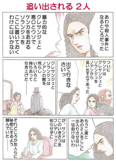 DEC 28, 2007 第107回 追い出される2人 連載 1.ソランジュの行動 サンドに出て行くように言われ、ノアンの館のものをいろいろと持ち去ったソラン ジュだが、さすがのソランジュも、夫クレサンジェが母サンドに暴力をふるったこと に対しては、クレサンジェに抗議したという。 林 倫恵子(はやしりえこ) 漫画家・ピアノ指導。ホームページ ショパン物語(林 倫恵子)TOP 連載一覧に戻る 第106回 暴力事件その2 第108回 助けを求めるソランジュ 現行サイトで見る → こちらも読んでみませんか 最初の子守歌から大きく成長した和声的変化の豊かさ ペヤチェヴィチ「子守唄 変ロ長調 Op.20」 眉間に皺を寄せず笑みを浮かべて弾く楽天的な音楽 モーツァルト「ピアノ・ソナタ 第2番 第1楽章 K.280 K.189e」 音楽大学を選ばず東大仏文科から作曲家になった異色の経歴 三善 晃