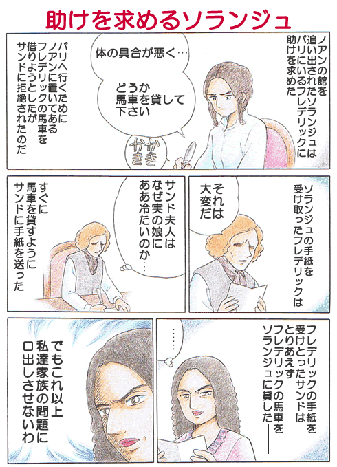 サンドは、とりあえずはショパンの「馬車をソランジュに貸すように」という依頼 を聞き入れ、ショパンの馬車をラ・シャトルに遣わした。