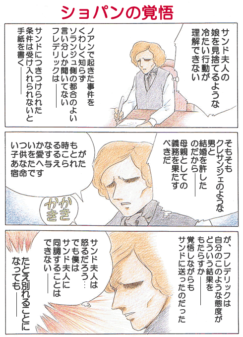FEB 22, 2008 第111回 ショパンの覚悟 連載 1.ショパンのサンドヘの手紙 1847年7月24日、サンドの最後通牒への返事として書いた手紙が、ショパン のサンドヘの最後の手紙となった 林 倫恵子(はやしりえこ) 漫画家・ピアノ指導。ホームページ ショパン物語(林 倫恵子)TOP 連載一覧に戻る 第110回 サンドの思惑 第112回 サンド激怒 現行サイトで見る → こちらも読んでみませんか 実は前年に「愛の挨拶」でプロポーズしたばかりだった エルガー「ソナティナ (ソナチネ) ト長調」 ファリャは、ピアノ作曲家としてよりも、近代バレエ作曲家として有名な作曲家であろう ファリャ「4つのスペイン小品」 85歳で交響曲第9番を書いた遅咲きの作曲家 ヴォーン・ウィリアムズ