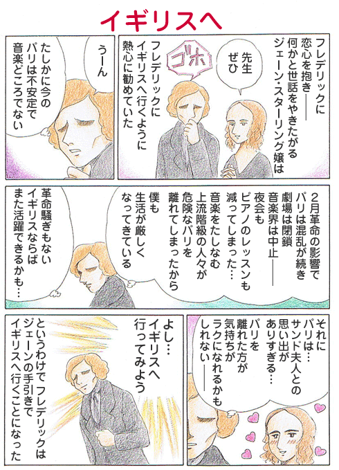 革命のおかげで、政情不安、社会混乱が続き、上流階級の人たちは「音楽」どころではなく、パリから避難し始め、夜会もピアノのレッスンも減ってしまい、ショパンも生活に不安を感じ、革命騒ぎのないイギリスに行く決心をしたようである。