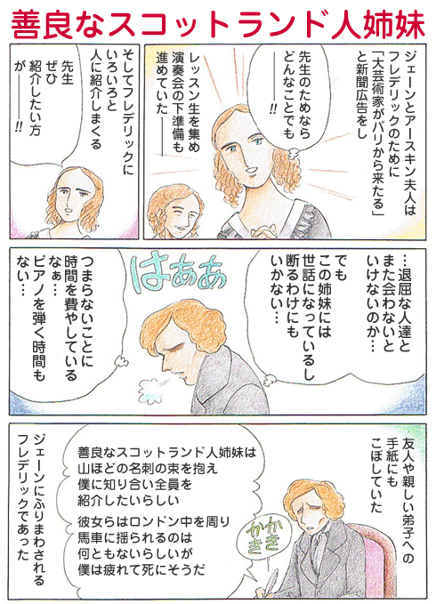 友人フランコムやグジマワへの手紙に「つまらないことに時間を費やしている」と書いたり、6月2日のグジマワへ宛てた手紙には、スターリング嬢やアースキン夫人ら「善良なるスコットランド人姉妹」に振りまわされ、「疲れて死にそうだ」とこぼしている。また7月8日の手紙には「わがスコットランド人姉妹は、親切ですが、時にはおそろしいほど私を退屈させるんです」とも書いている。
