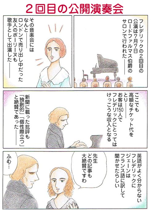 ショパンはサートリス夫人とはパリで知り合っていた。そのときはまだ旧姓ケンブルといい、有名な歌手であったという。そのサートリス夫人の自邸で、ショパンにとってロンドンデビューとなる演奏会が6月23日午後3時より開かれた。ショパンのほかには有名な歌手が共演した。なお、この6月23日は、パリでは暴動が起き、ショパンはパリにいる友人知人を心配していたが、無事であったという。