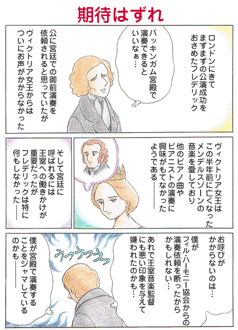 ロンドンでの2回の公演が絶賛され成功したので、人々は「バッキンガム宮殿へ呼ばれるだろう」「女王は密かにショパンにピアノのレッスンを受けている」などといううわさまで流れ、ショパンもバッキンガム宮殿での御前演奏を期待していたが、女王からはお呼びがかからなかった。そのことを、フィルハーモニー協会からの演奏依頼を断ったからかもしれない、とグジマワへの手紙に書いている。女王の催す音楽会を仕切る王室音楽監督は、フィルハーモニー協会のオーケストラも指揮していた。