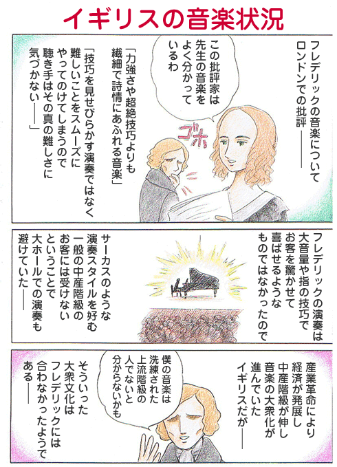 産業革命によって中産階級が振興し、その中産階級をターゲットにした音楽会が盛んになっていった。それらは大きなホールで演奏会が行わたが、ショパンの繊細な演奏には合わない場所であった。超絶技巧、大音量といった人々が求める趣味も、ショパンには合わなかった。